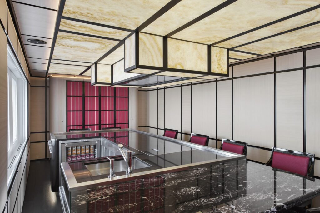 For outdoor enjoyment, there’s an aft beach club at the water’s edge, a swim-up bar on the top deck, and numerous sun pads and sofas across her decks for relaxed lounging.