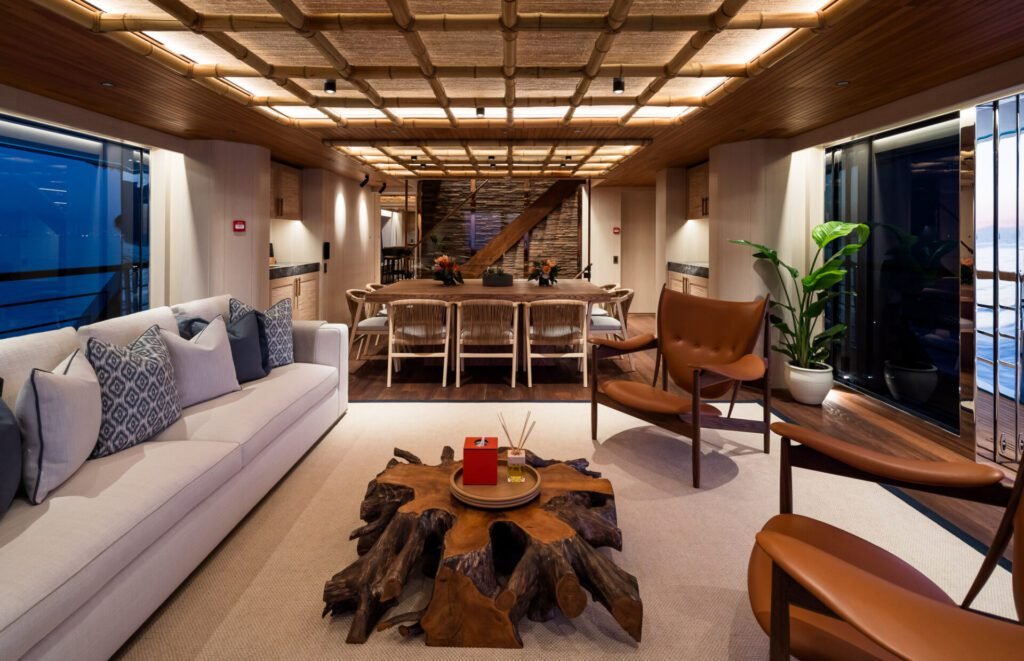 Guests can enjoy meals at the elegant formal dining table or more casually at the breakfast bar adjacent to the galley. Al fresco options include seating around the Teppanyaki grill counter on the bridge deck or gathering at the circular aft table, where lunch is accompanied by the refreshing ocean breeze.