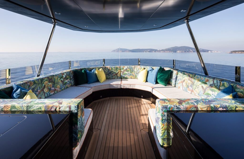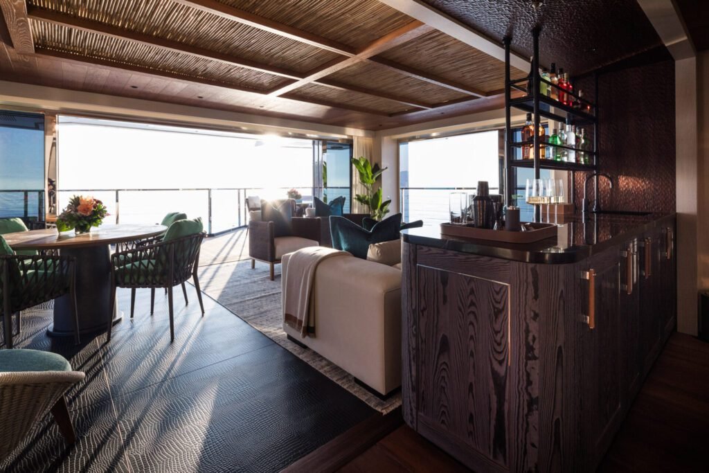 Notable highlights include an expansive and versatile aft deck, a distinctive hot-and-cold plunge pool on the foredeck, two saloon lounges with floor-to-ceiling glass panels that open on three sides, and an innovative crow’s nest ‘snug’ providing incredible, elevated panoramic views.
