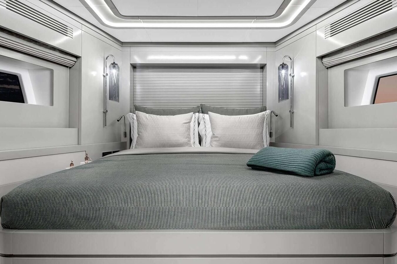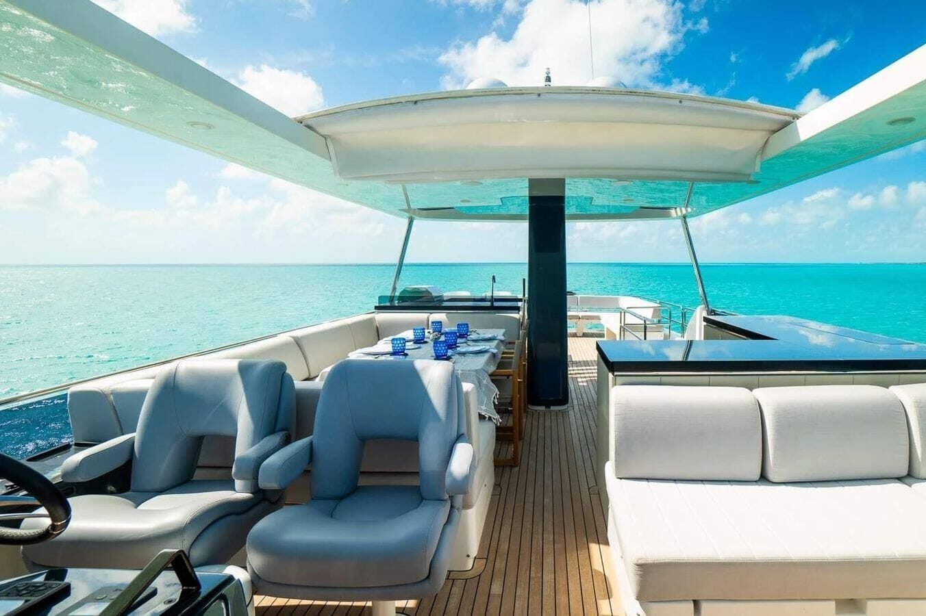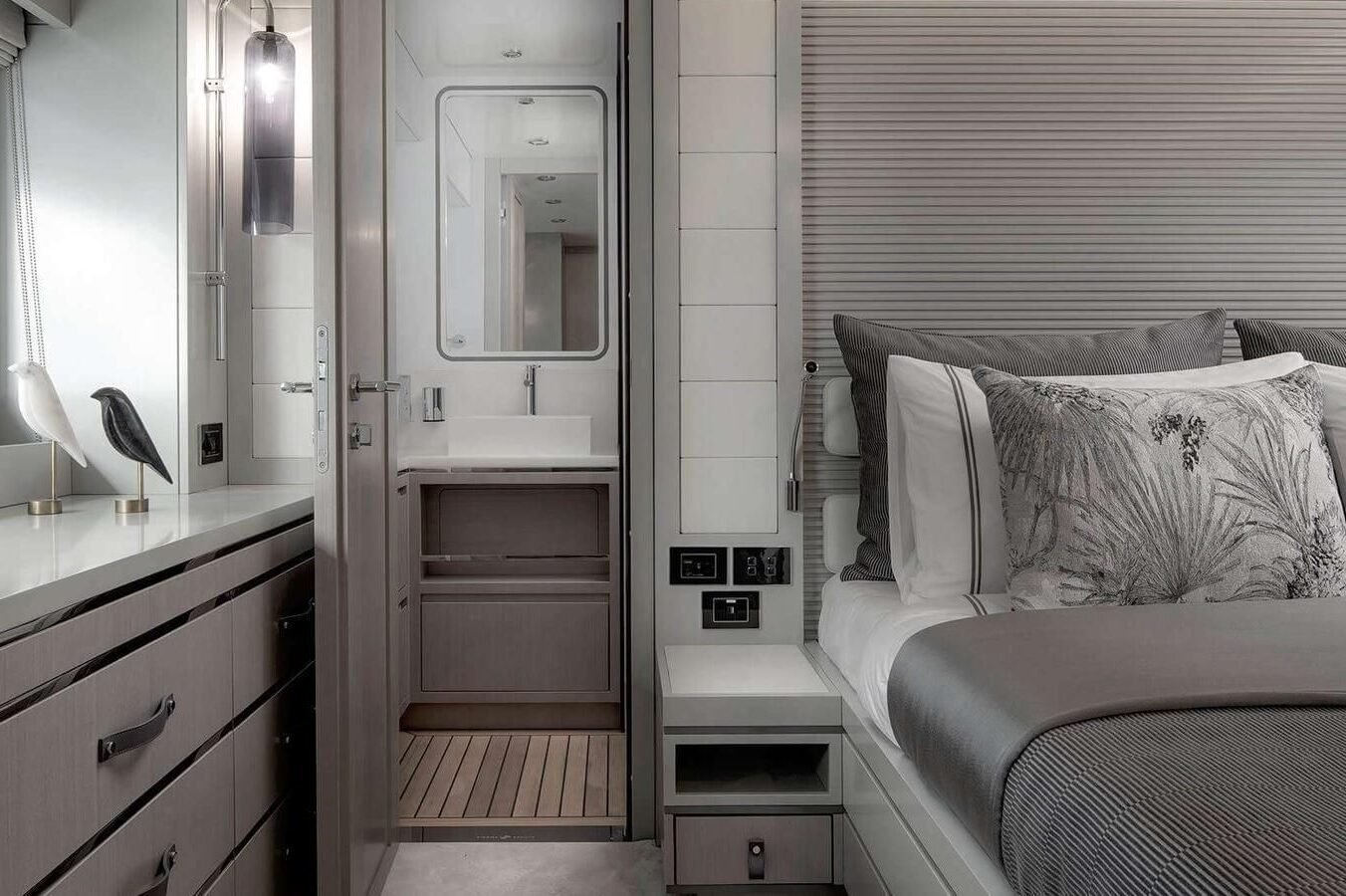 NORMAN’S T4 is a refined 68‑foot motoryacht masterfully crafted by Sirena Yachts in 2022. Her sleek lines and generous 5.79 m (19 ft) beam create an airy, light‑filled interior that flows effortlessly into sociable outdoor lounging and dining areas, including a sun deck with retractable hard roof, expansive foredeck, and welcoming aft platform. Inside, calm neutral tones and elegant furnishings foster an inviting atmosphere throughout the open‑plan salon and dining area, while panoramic windows ensure seamless connection to the sea. Her lower deck houses three beautifully appointed ensuite guest cabins—a full‑beam master, a double VIP, and a twin—each finished with luxurious linens, stylish décor, and modern conveniences, ensuring every guest feels pampered. With a cruising speed of 10 knots and a top speed of 17 knots, she delivers smooth, effortless performance ideal for exploring the Bahamas’ crystalline waters. A crew of two attends meticulously to every need, providing privacy and seamless service. Equipped with paddleboards, snorkeling gear, tender, and beach‑setup options, she offers effortless transitions between onboard relaxation and thrilling water adventures.