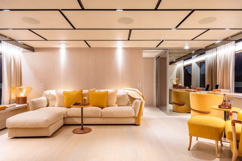 A highlight of R.M.F. is the stunning beach club, which opens out to 270-degree views via fold-down balconies. Sunlight dances into the space through the glass-bottomed pool above, creating a serene atmosphere perfect for relaxation. The beach club doubles as a wellness sanctuary, complete with a steam room, shower, and fitness area. Ingeniously, it also transforms into a floodable garage to house the 7.2m Castoldi tender when not in use.