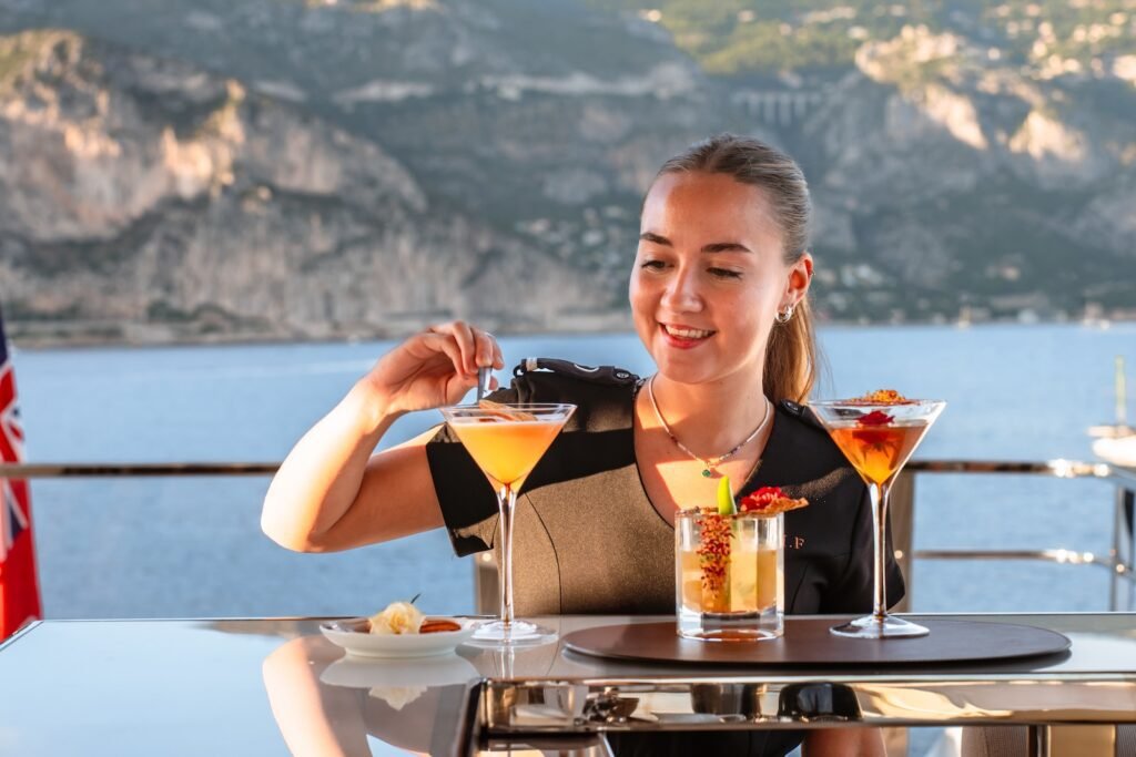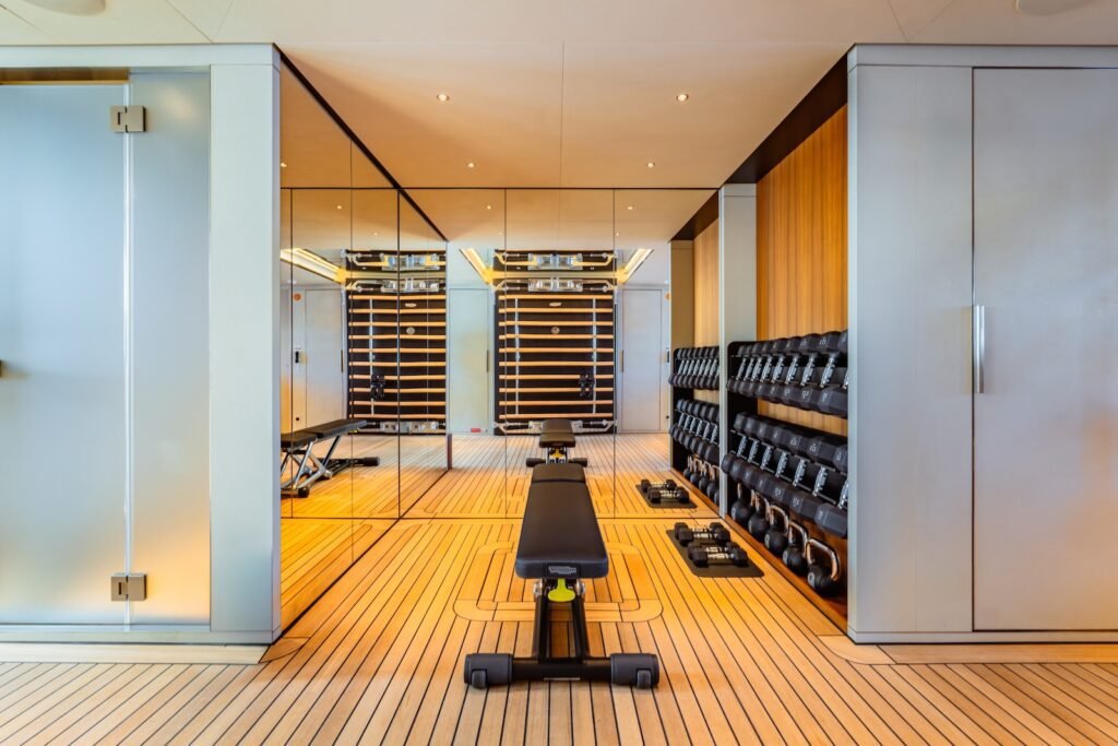 Every inch of R.M.F. is designed for guest enjoyment. The foredeck offers two casual lounge areas for relaxed conversations and quiet moments. The sun deck features a bar and flexible furniture layout, easily converted for outdoor yoga or workouts. A striking glass-bottom pool on the main deck adds a wow factor and complements the shaded al fresco dining area. For formal meals, the bridge deck hosts a 12-person dining table with sweeping ocean views, ideal for long, elegant dinners under the stars.