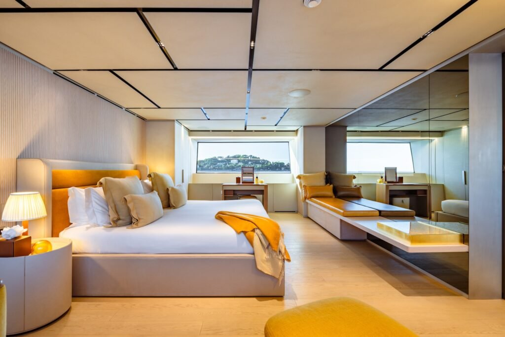 R.M.F. accommodates up to 10 guests in five beautifully appointed staterooms. The owner’s apartment is located on the main deck and includes a centerline king-size bed, a full-beam ensuite bathroom, and a private office space—offering both luxury and seclusion. On the lower deck, two VIP staterooms feature his-and-hers sinks and walk-in showers, while two convertible twin/double cabins add flexibility for families or groups of friends. Flooded with natural light from full-height windows on both the main and upper decks, the interiors create a bright, welcoming ambiance throughout.