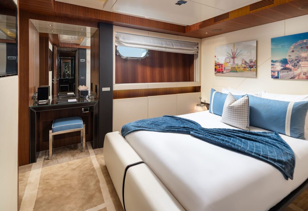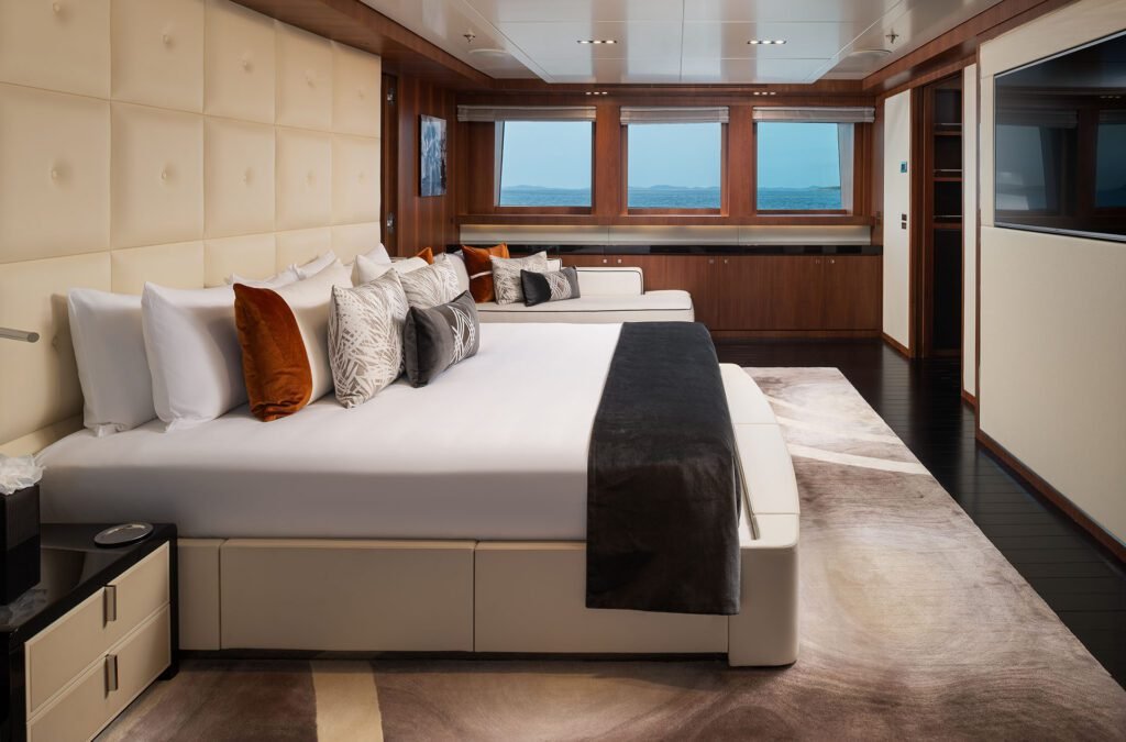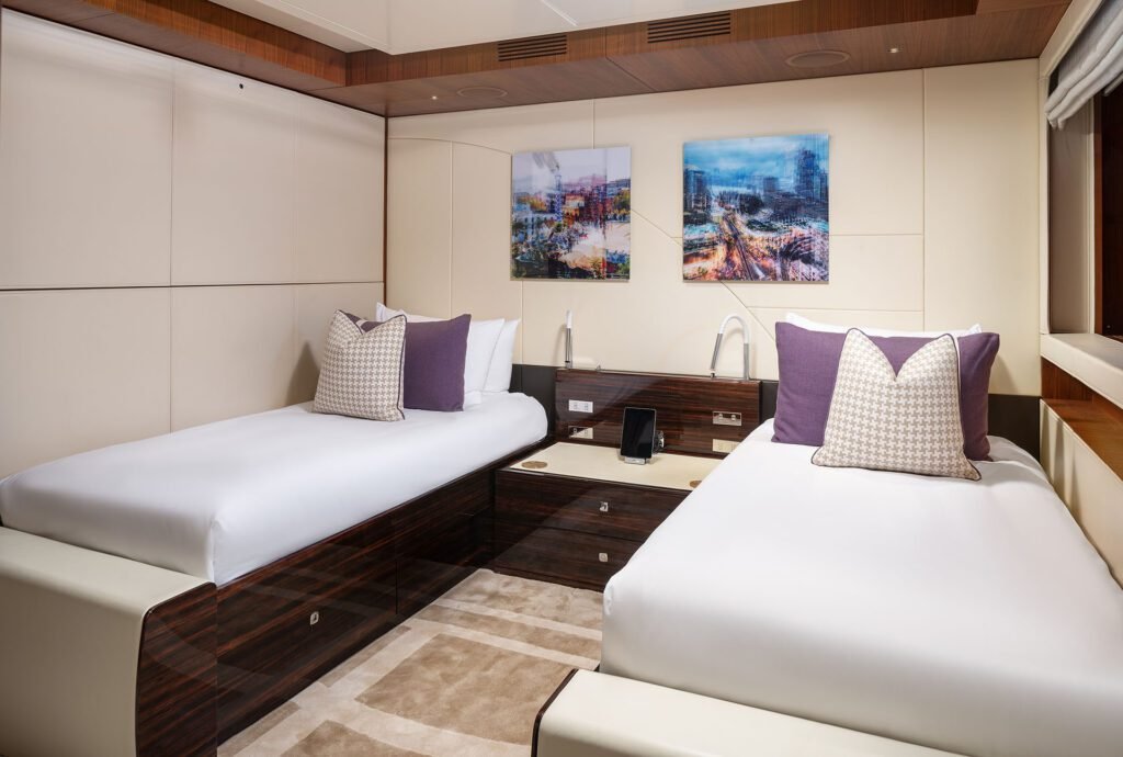 Accommodation is provided for up to 12 guests in six cabins. The master suite and VIP suite are located on the main deck, while the lower deck features two double cabins and two twin cabins, each with an additional Pullman bunk.